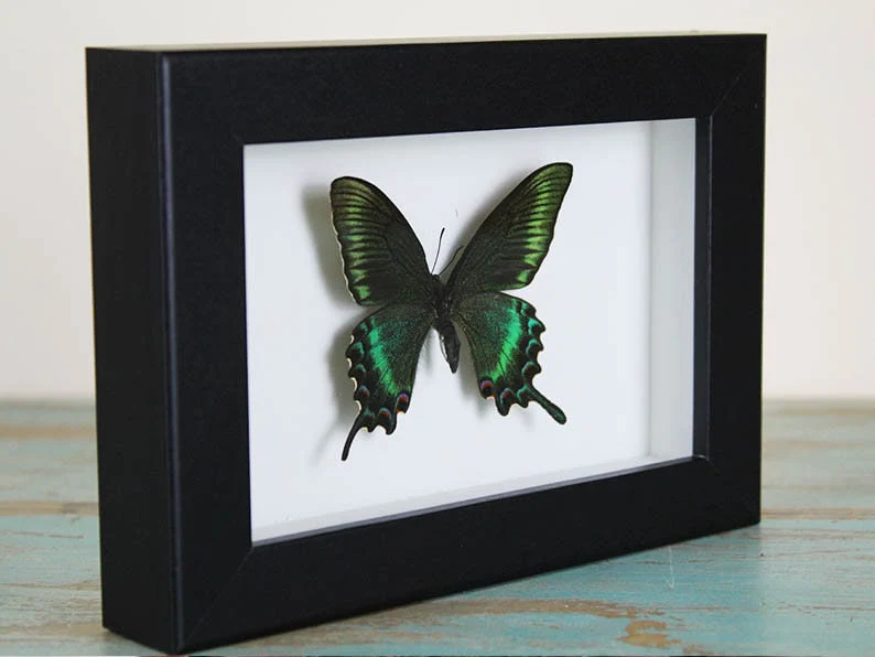 Welcome a story of communal beauty and iridescent light into your home with this exquisite Black Alpine Butterfly, tenderly preserved in a classic shadowbox frame. This piece is a heartfelt meditation on connection and the breathtaking artistry of nature. Its presence is a source of quiet inspiration, a reminder of the beauty that unfolds when we come together in a dance of shared grace.